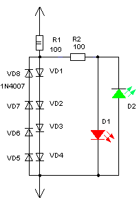 смонтировано в прозрачном корпусе, вместо двух светодиодов можно поставить один, меняющий цвет в зависимости от полярности.