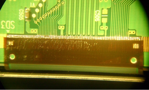 грею с краю (кстати сам край срезаю на 1.5мм, чтоб доступ был лудше). Контроль под микроскопом - видно как олово паяется со шлейфом (через сам шлейф видно). Было хреновое настроение так я феном посадил за 20сек, правда при этом прихватил края. а прижимал лезвием от канцелярского ножа. Больше так не делаю, можно перегреть места соединения со стеклом и само стекло спалить. Впрочем если настропалиться, я ведь припаял!