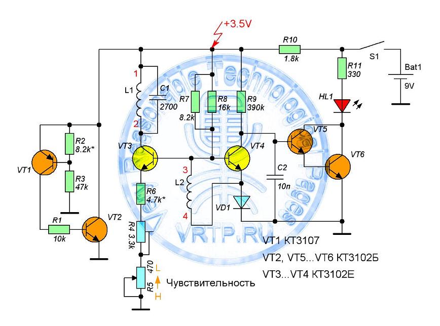 Когда-то очень давно, году в 85-м, работая электриком, собрал схемку из брошюрки "В помощь радиолюбителю". Номер 80. Автор - А. Малахов. Мультивибратор на двух транзисторах, и полевик. К затвору подключена антенка. Никаких катушек. Очень понравился. Расхваливал всем, пока не спёрли.