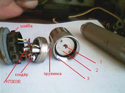 Головка с резьбой, накручивается на основание, в котором установлены сопрот, ёмкость и КП303.Сверху на основании - пластмассовая шайба с выступами для удержания при накручивании головки.