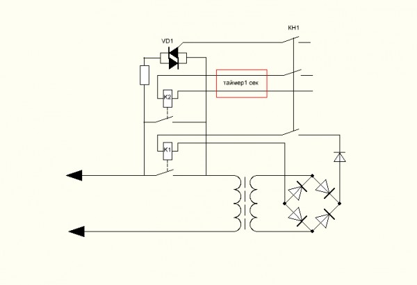 3) по таймеру срабатывает реле К2 и дублирует первое реле.