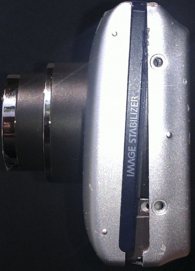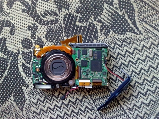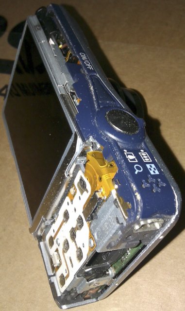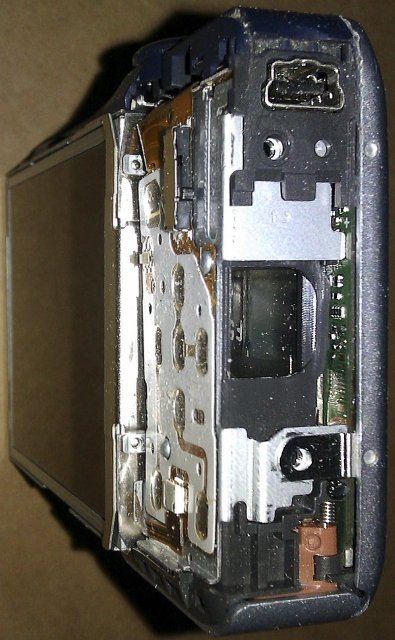 Вставил аккумулятор, для того чтобы послушать шум привода объектива при нагрузке и изнутри подсветить лампой автоматической фокусировки. Включил фотоаппарат - объектив слегка хаотично сдвинулся вперёд-назад, задвинулся внутрь и фотоаппарат то ли выключился то ли перешёл в режим "альбома" (пишу "то ли" потому что на режим не стал обращать внимания, хотел убедиться что объектив снова подчиняется приводу, и сразу выполнил выкл./вкл.).