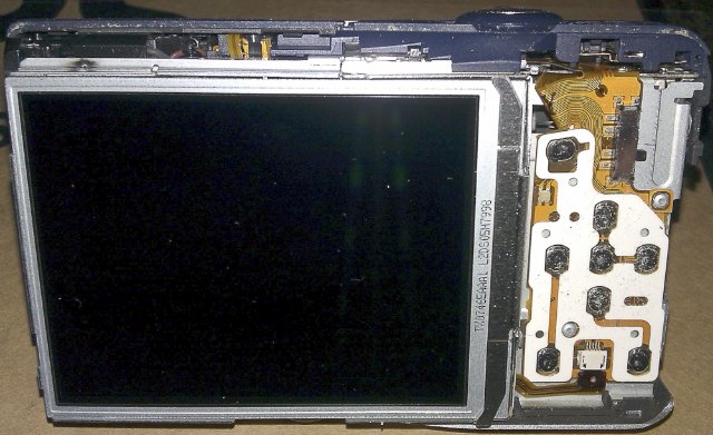 Наверно нужно снять ЖК-экран, но вроде бы нужно отсоединить его шлейф, а он кажется крепится с передней стороны, а её защищает крышка которую мешает снять выдвинутый объектив. |