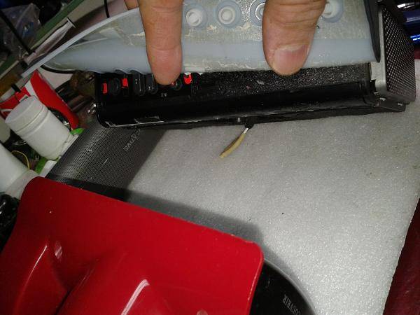 Потом вообщем ,где резину сзади снял (задняя сторона с кнопками),там открутил все винтики (белые винтики) держат модуль переключателей и регулировок,черные три винта держат снаружи-внутреннюю заглущку,закрывающую модуль коммутацыи и разъемов (если их не открутить,то майн не вытащишь вверх к себе). Модуль настроек с регул.-отсоеденить вначале изнутри шлейф с колодкой. Чтобы снять майн,откручиваем все черные винты,снимаем заглушку пластиковую разъемов коммутацыи,отсоеденяем колодки (они промазаны красной липучкой),вытаскиваем майн под углом (прямо вверьх не вытаскиваеться).