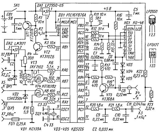 Там же ясно сказано, что только оксидные емкости начиная с 1 - 2 мF. Измеритель лучше собирать по последнему варианту схемы с одним трансформатором. |