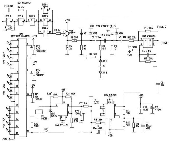 R3 680 Om.* R2 12 Om. C1 0.22. C2 680 pF. С3 47 mF. IC 155ЛА3. D1 Д9. Д20. Транс генератора: I - 100 вит 0, 09. II - 1,5 вит 0,56. Транс измерителя: I - 10вит 0,56. II - (к прибору) 100вит. 0,09. Намотка на ферритовых кольцах 10 - 12 мм. размеры не критичны. |