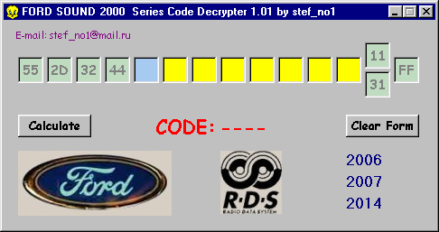 Текущий файл» Раскодировка автомагнитол» Калькуляторы» FORD SOUND 2000 Series Code Decrypter 1.01 |