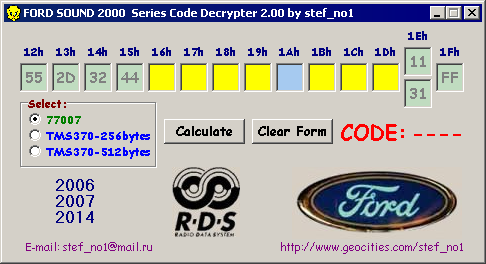Текущий файл» Раскодировка автомагнитол» Калькуляторы» FORD SOUND 2000 Series Code Decrypter 2.00 |