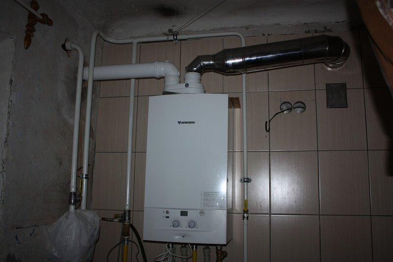 Предыстория: Делали нам в доме отопление, проектировщики при этом что-то напутали, установили котел с атмосферной тягой, под него сделали дымоход через крышу (вертикальная труба из нержавейки со стоком конденсата и лючком внизу). Газовики сказали, что такой котел не подходит, слишко маленькое помещение. В результате котел заменили на турбо