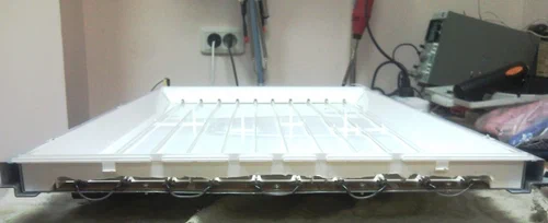 Принесли аппарат после мастеров. Верхняя плата-держатель ламп сгорела в труху,вонь,черная смола из гетенакса. Они ее распилили и одну из ламп заменили перемычкой (на всю длину лампы). Защиту на инверторе отключили .Поэтому все воняло горело и дымило,но показывало. По адекватной цене платку не нашел,пришлось вырезать из текстолита самому,максимально приблизил рисунок к оригиналу. Поставил, защиту восстановил,слышу снова шипит и вырубается. Только потом замерил,одна из ламп на самодельной плате не горит. Заменил и все стало нормально. Получается,что эти платы совместно с риcунком канавки на "корыте " образуют разрядник. И если одна лампа не запустилась в паре,то напряжение увеличивается ,пробивает этот разрядник и вырубает инвертор. Соответственно, если мы крепим лампы,как написано выше,то эта цепь не срабатывает. А нужна она или нет,тут уже каждый решает сам для себя. |