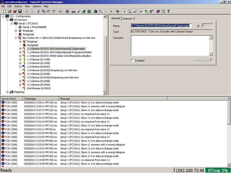 TwinCAT IO Server: Source: TCIO; Timestamp: 5/20/2013 1:20:34 PM 604 ms Message: Gerдt 1 (FC310x): Slave 11 answers with a wrong telegram