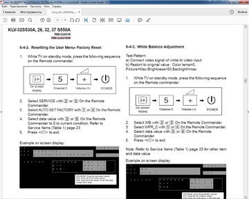 Как и написано в мануале, из дежурки набираю на ПДУ "I+", "5", "VOL+", «Power on», но телевизор просто включается. Пробовал и медленно, и быстро, без результата, в сервис не заходит. Нет ли какой ни будь особенности вхождения в сервисный режим у данной модели?