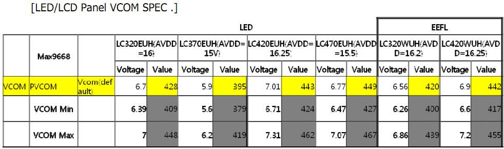 Значит напряжение Vcom, установленное в данном T-con не вписалось в среднюю точку, относительно которой в обе стороны начинается отсчёт градаций в ЦАП драйверов матрицы соответственно для чётных и нечётных столбцов. |